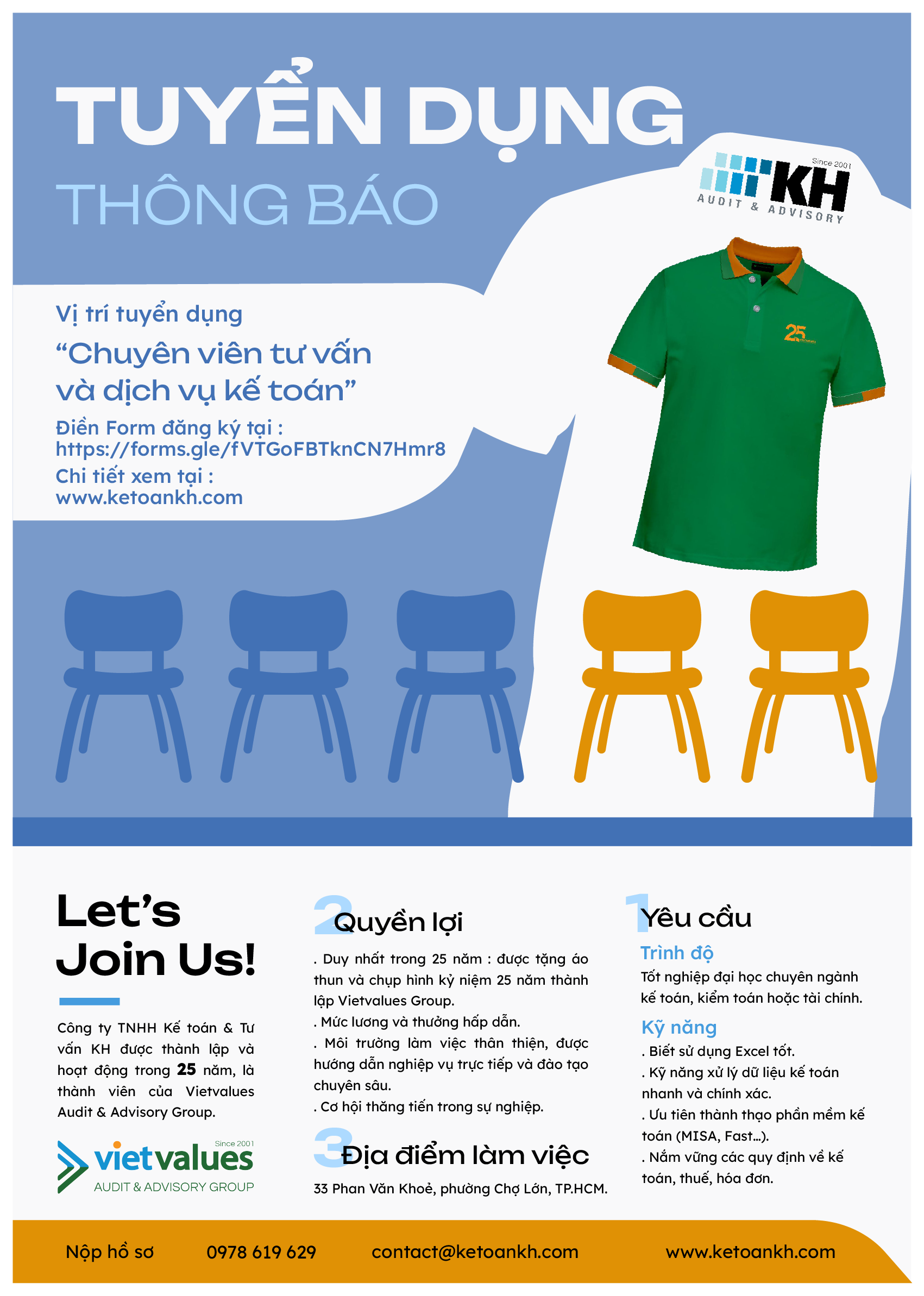 Công ty TNHH Dịch Vụ Kế Toán KH – Thành viên của Vietvalues Group, với hơn 25 năm kinh nghiệm trong lĩnh vực kế toán, kiểm toán và tư vấn tài chính, hiện đang tìm kiếm những ứng viên tài năng và tâm huyết để gia nhập đội ngũ chuyên nghiệp của chúng tôi.
